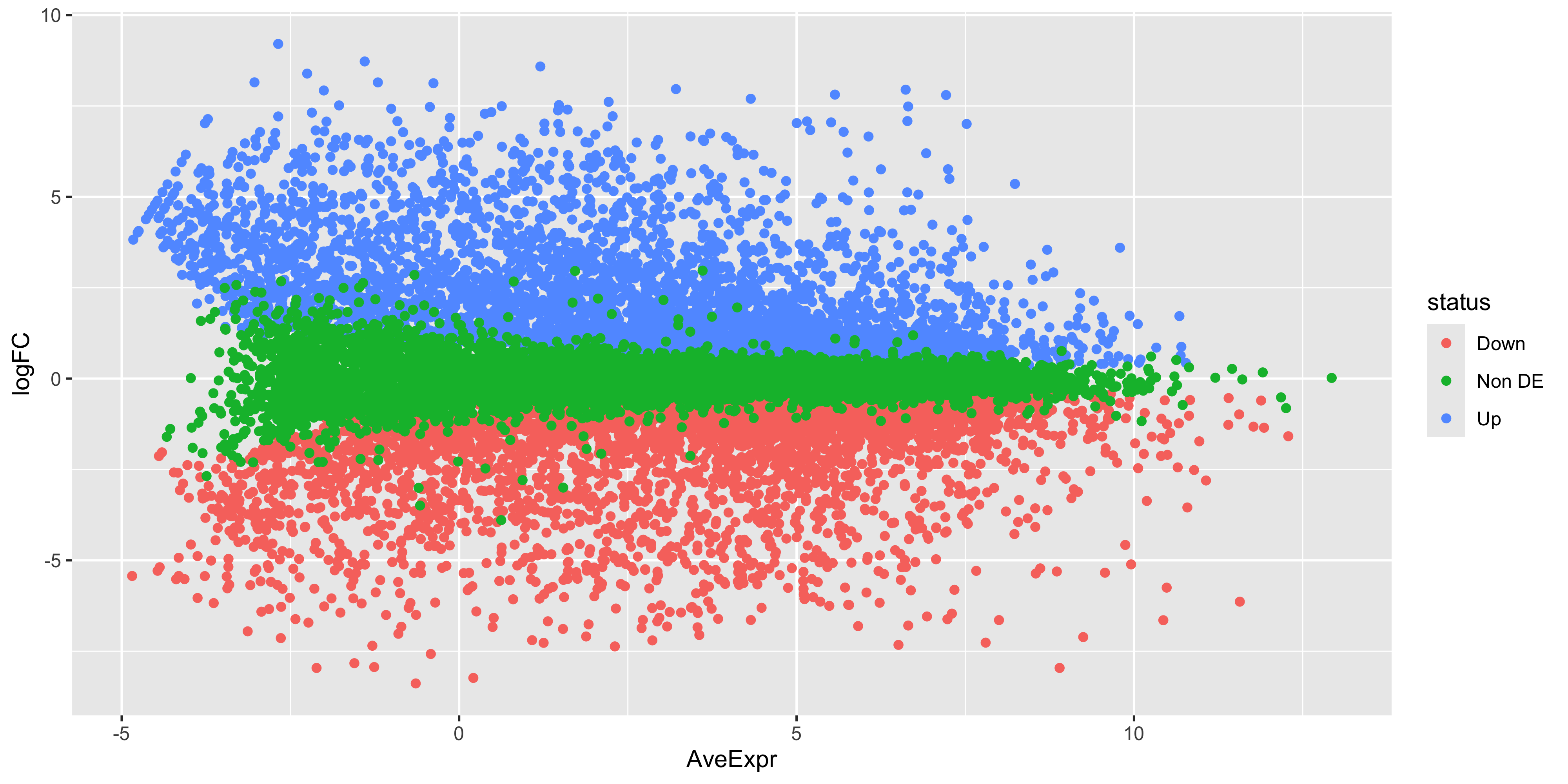 While the coordinates of the points are the same, there is still quite a bit of work to do to make this plot look like the one produced by plotMA(). First we have the fix up the colours of the points. We also have to make it such that the non-significant points are plotted below the other points. To do this we would need to make it so that the non-significant points are plotted first. We can do this by reordering the levels of the status factor so that the non-significant points are plotted first. Labels can also be added using ggrepel for the top 10 DE genes in each direction.